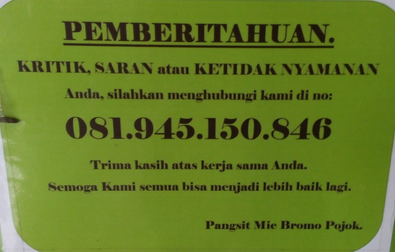 Oh ya, semua makanan ditempat ini adalah makanan HALAL. Jadi jangan khawatir untuk menikmati kelezatannya hidangan yang ditawarkan oleh Depot Pangsit Mie Bromo Pojok yang buka setiap hari mulai jam 9:00 pagi.
