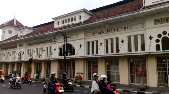Di seberang Gedung Merdeka terdapat bangunan kuno yang sangat terawat, dan saya kira ini masih bentuk asli dari bangunan itu. Diatas bangunan itu terdapat tulisan dalam bahasa Belanda : ” Landbouw Benoodigdheben Impor Commissionairs Venduhouders Warenhuis De Vries Export Kunst Boek – Paper Handle” . Tidak tahu apa artinya tapi dari informasi yang saya dapatkan bangunan ini dulunya adalah sebuah toko serba ada pertama yang ada di Kota Bandung, Toserba De Vries yang dimiliki oleh M. Klass de Vries.