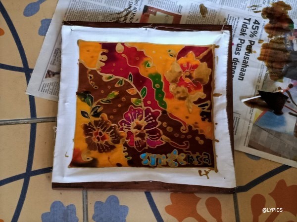 Setelah kurang lebih tiga jam, kegiatan selesai. Ternyata asik juga mencampur warna dan menggabungkan titik gambar. Saya jadi mengerti mengapa batik tulis itu mahal. Dibutuhkan ketekunan, keterampilan, ketelitian dan kesabaran yang tinggi untuk menghasilkan satu lembar kain batik tulis yang cantik. Bukan sekedar membatik, tetapi ini adalah sebuah karya seni.