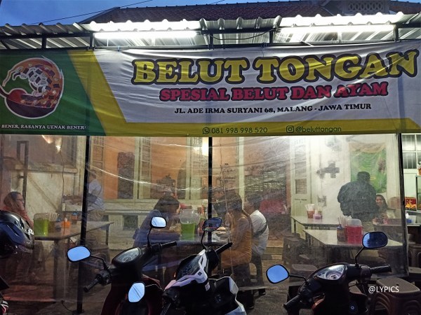 Gerai Belut Tongan menggunakan tenda plastik bening tebal. Sehingga walaupun hujan, pelanggannya tetap bisa menikmati makanan dengan nikmat. Sekaligus mudah ditemukan karena tempatnya terlihat dari jalan raya.
