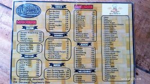 Saat kami datang, area parkir Warung De Sawah yang memang terletak di tengah sawah ini masih relatif kosong. Namun didalamnya telah ada beberapa meja yang terisi tamu. Segera kami memilih tempat duduk untuk 6 orang dan pramusaji memberikan daftar menu yang dapat kami pilih.