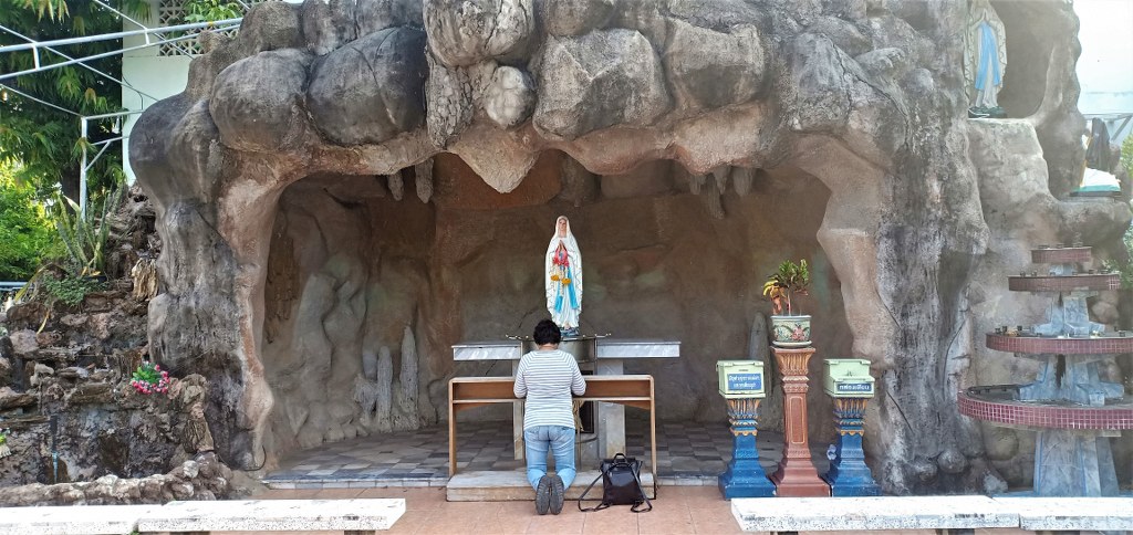 Setelah selesai misa, akhirnya saya bertanya juga kepada beliau. Ternyata jadwal misa dalam bahasa Inggris adalah pada setiap hari Sabtu jam 18:30. Sedangkan semua misa di hari Minggu baik jam 07:00, 09:00 dan 18:30 diselenggarakan dalam bahasa Thailand. Sesuai dengan namanya, Our Lady of Lourdes, di halaman gereja ini terdapat sebuah gua dengan patung Bunda Maria dimana umat dapat berdoa disana.