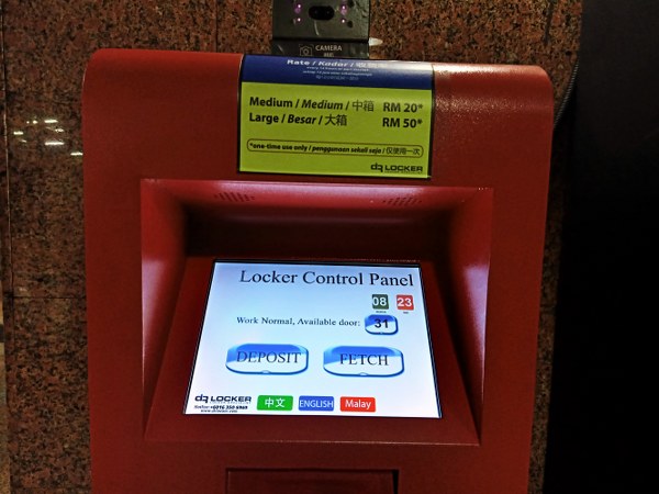 Tidak ada petugas yang akan membantu Anda. Ikuti saja petunjuk yang muncul pada layar sentuh di mesin yang berbentuk seperti mesin ATM. Masukkan lembaran uang kertas Ringgit tentunya. Biaya sekali pakai adalah RM 20 untuk loker ukuran sedang dan RM 50 untuk loker ukuran besar (November 2019).