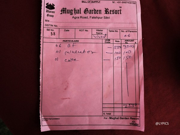 Harga satu paket buffet di The Lounge Mughal Garden Resort Agra Road India ini adalah 550 Rupee. Kalau dirupiahkan sekitar Rp. 107.000 (nilai tukar 1 Rupee = Rp. 194). Harga ini sudah termasuk teh atau kopi. Jika Anda ingin menikmati minuman lain, tentunya ada biaya tambahan yang harus Anda bayar.