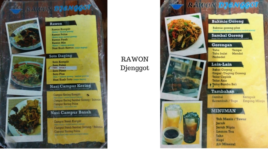 Menu yang di jual di Depot Rawon Jenggot di Jalan Sukarno Hatta ini bervariasi. Dari rawon, soto hingga nasi campur. Menu rawonpun beraneka mulai rawon komplit yaitu rawon yang dilengkapi dengan sambel goreng hingga rawon biasa.