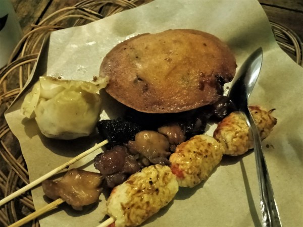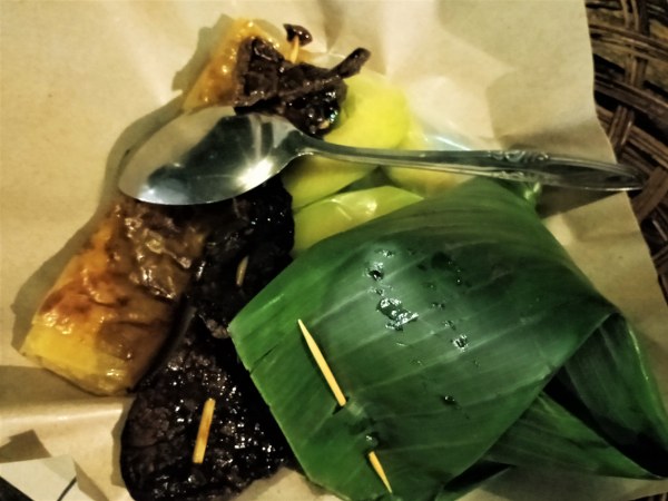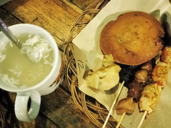 Saya memilih beberapa jajanan seperti ote-ote, lemper, sate usus dan tape panas. Sedangkan teman saya memilih nasi kuing, sate jerohan, asinan kedondong. Perpaduan makanan yang kurang pas tapi kami menikmatinya. Sayangnya nasinya agak keras. Asinan kedondongnya yang segar!