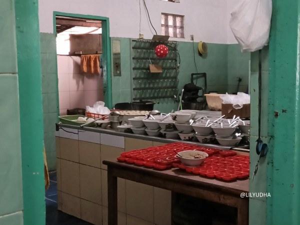 Dapur tempat menyiapkan pesanan pelanggan dapat kita lihat dari meja tetapi hanya karyawan Bakso Barokah 313 yang dapat masuk ke area tersebut. Saya lihat dapurnya cukup bersih dan teratur. Mangkuk-mangkuk telah disiapkan sehingga jika ada pelanggan datang, pesanan dapat segera disiapkan.