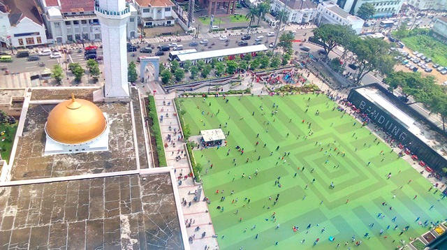 Dari atas menara ini, kita dapat juga melihat indanya Alun-alun Kota Bandung. Lapangan rumput hijau yang tadi kita lewati akan nampak begitu indah dari atas.