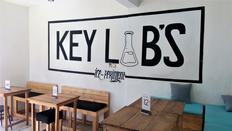Oh ya, tempat makan es krim dengan nitrogren cair ini namanya Cafe Keylab’s. Sebuah cafe yang mengangkat tema laboratorium bahkan para pramusajinya juga mengenakan jas lab layaknya bekerja di sebuah laboratorium. Cafe ini terletak di Jalan Panderman Nomor 2 Kota Malang. Berada tepat di belakang KFC Jalan Kawi. Jadi pasti akan sangat mudah ditemukan baik bagi mereka yang membawa kendaraan sendiri maupun yang menggunakan angkutan umum.