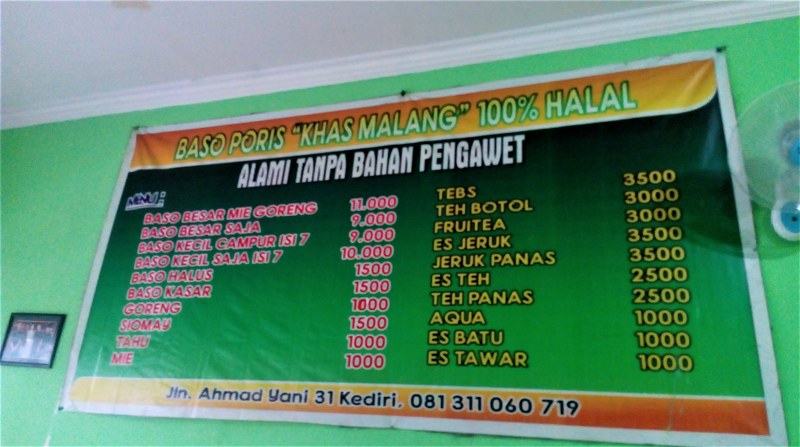 Harga bakso di Bakso Poris Khas Malang di Kediri ini beraneka ragam tergantung jenis bakso pilihan Anda. Yang paling lengkap adalah bakso besar, mie dan goreng yang dipatok dengan harga Rp. 11.000. Untuk 1 buah bakso besar, harganya adalah RP. 9.000. Sedangkan harga bijian untuk masing-masing adalah berkisar antara Rp. 1.000 – 1.500 (Harga Maret 2017) . Cukup ramah di kantong bukan? Apalagi bagi pecinta bakso seperti saya, wah, bisalah 2 mangkok sendiri nih. Oh ya untuk minuman yang tersedia hanya minuman kemasan.
