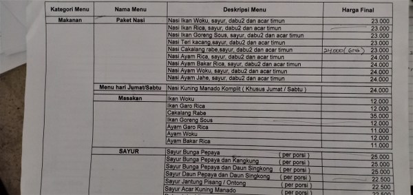 Mungkin menu yang Anda inginkan tidak ada setiap harinya. Tetapi jika Anda memang ingin memesan makanan Manado tertentu, Anda bisa memesannya kepada Ibu Astuti untuk dimasakkan. Oh ya, ada klapertaart yang tersedia setiap hari loh. Ini salah satu makanan favorit saya!