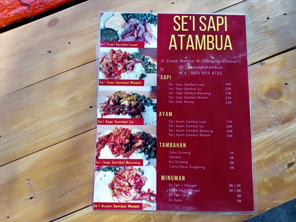 Untuk dapat menikmati olahan Sei Sapi Atambua pedas lezat di Kota Malang ini, Anda tidak perlu merogoh kantong terlalu dalam. Harga makanan disini berkisar antara Rp. 17,000 – Rp. 22,000 per porsinya. Sedangkan untuk minuman, harganya berkisar antara Rp. 2,000 – Rp. 6,000 (harga tahun 2018). Kenyang kok makan seporsi nasi sei sapi di Sei Sapi Atambua ini. Karena selain daging, terdapat nasi, sayuran dan juga tahu goreng.