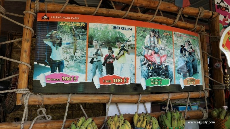 Chang Puak Camp juga menawarkan paket untuk beberapa gabungan kegiatan yang dibanderol harga 1.000 Bath per paket untuk tiap orangnya. Setelah melihat-lihat situasi, kondisi dan fasilitas yang ada di Chang Puak Camp ini, kami bertiga memutuskan untuk tidak melanjutkan wisata kami di tempat ini. Maaf ya, menurut kami tempat ini kurang menarik apalagi jika dibandingkan Taman Safari di negara kita.