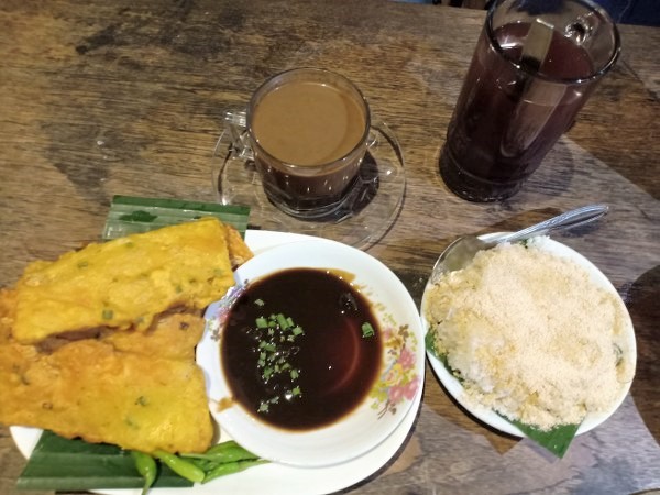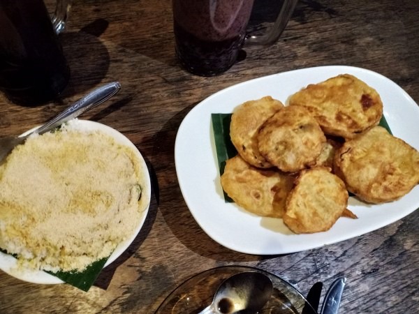 Akhirnya kami memilih beberapa kudapan yang dulu pernah dinikmati dengan kakek-nenek kami. Ada wedang tape, ketan bubuk, pisang dan sukun goreng. Sebenarnya kami ingin mencoba yang lain seperti nasi soto, mi goreng, ceker dan masih banyak menu lain. Sayangnya, perut kami sudah tidak sanggup.