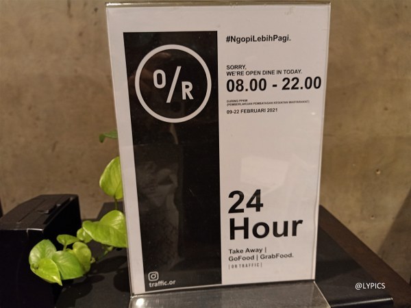 Sebelum pandemi, Cafe Traffic.OR ini beroperasi 24 jam. Namun saat ini jam operasionalnya menjadi 08:00 – 22:00. Hanya pembelian online dan untuk dibawa pulang yang tetap dilayani 24 jam.