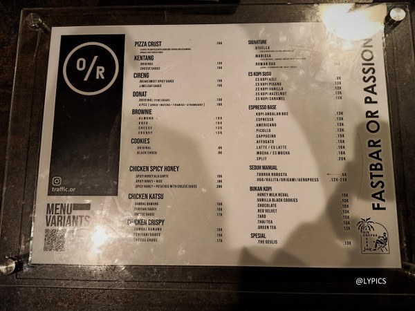 Segera kami naik ke lantai dua dimana pengunjung dapat memesan makanan dan minuman olahan Cafe Traffic.OR. Menu yang ditawarkan cukup banyak. Sayangnya saat itu kami masih cukup kenyang jadilah kami melewatkan pizza yang menjadi salah satu menu andalannya. Alasan kedua untuk kembali kesini.