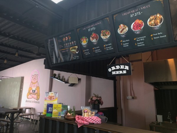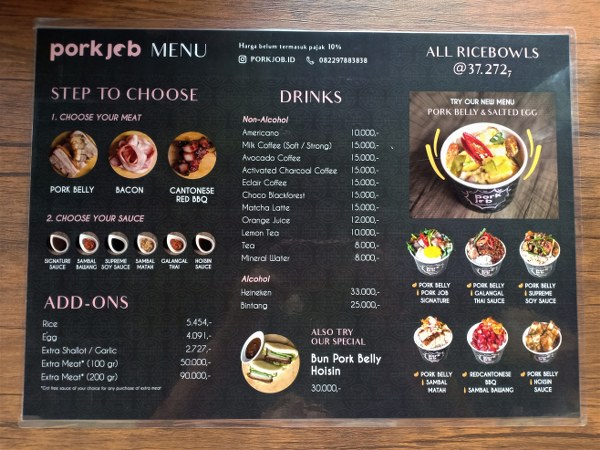 Segeralah memilih pesanan Anda dari menu yang tersedia di meja kasir. Setelah itu bayarlah, lalu duduk sambil menunggu pesanan disiapkan. Menu apa yang enak di Pork Job ini? Jujur saja, menurut saya semua makanan di sini enak.