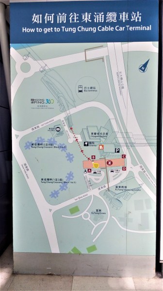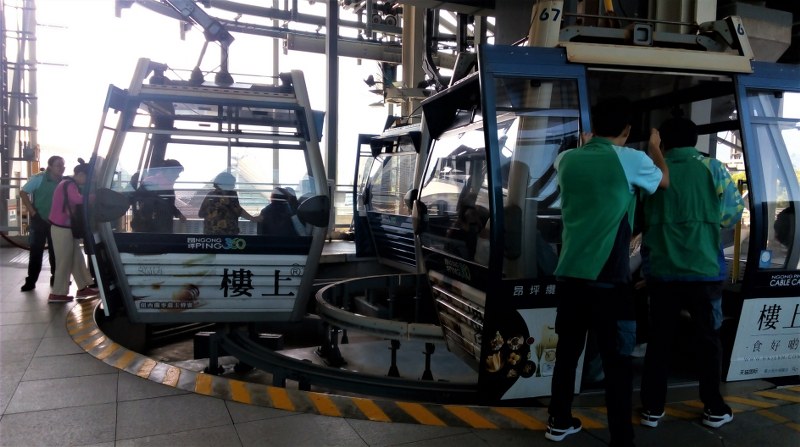 Akhirnya saya tiba di Stasiun MTR Tung Cung (Tung Cung Cable Car Terminal). Dari situ saya harus segera mencari terminal untuk kereta kabel menuju Ngong Ping. Inilah pengalaman yang tak akan terlupakan karena saya akan menaiki kereta gantung yang alasnya dari kaca tebal. Jadi dari ketinggian, kita dapat melihat melalui lantai kereta gantung, keindahan yang ada di bawah sana. Sedikit merinding dan takut tetapi karena tiket yang saya beli sebelumnya di Golden Crown Hostel sudah ada ditangan, maka saya beranikan diri untuk naik.