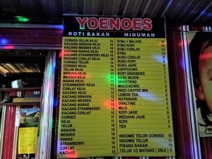Harga makanan dan minuman di Yoenoes Penjual Roti Bakar dan STMJ Enak di Kota Batu ini cukup ramah dengan kantong anak muda. Harganya mulai dari Rp. 4.000 – Rp. 18.000 (Harga bulan Juli 2018). Yang termahal adalah untuk roti bakar dengan isian kornet, telur dan keju. Yah, dapat dimaklumi karena isiannya lengkap dan berat.